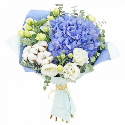 Волшебное сочетание гортензии, хлопка и эустомы с добавлением эвкалипта.