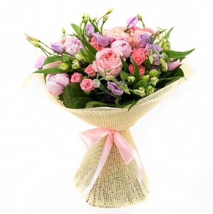 В этом букете идеально сочетаются пионы с эустомой и кустовой розой. Для украшения и создания пышности букета добавлены листья салала и упаковка из фетра.